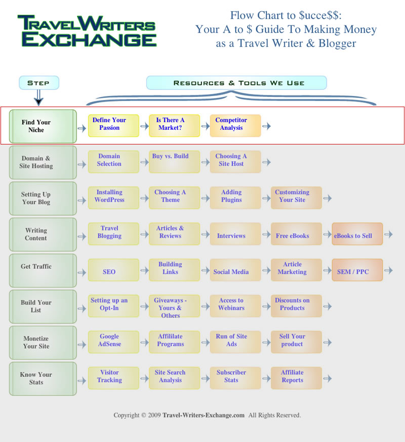 When Suzy and I first chatted about her desire to have a travel blog, focused on a specific travel niche, upon which she could write about what she really loves and make money doing it, I put together a “flow chart” of action items that she would need to follow.